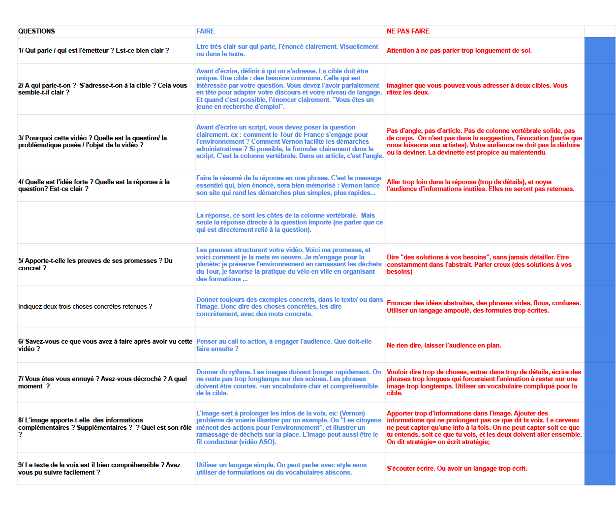La première, de l’association du Tour de France et une autre de la Ville de Vernon. Après ces exercices, Cécile Margain a partagé un tableau A faire / A ne pas faire, voir ci-dessous.