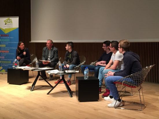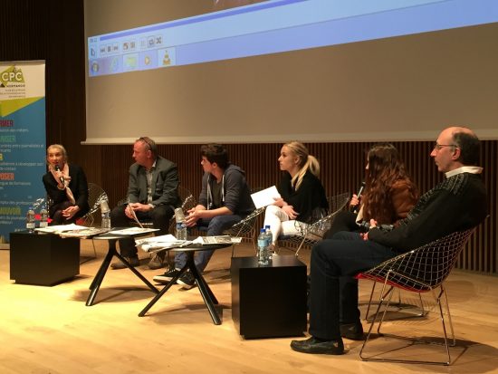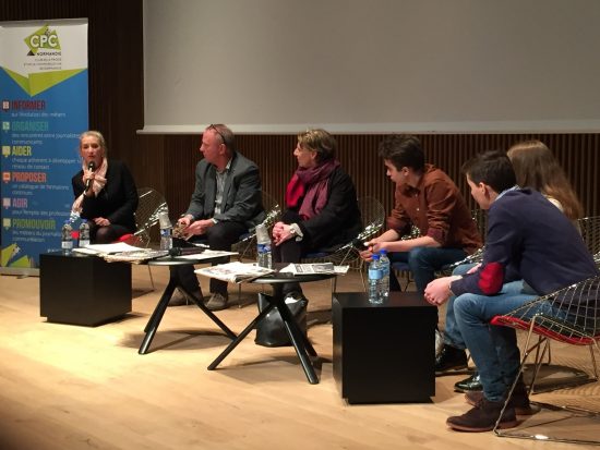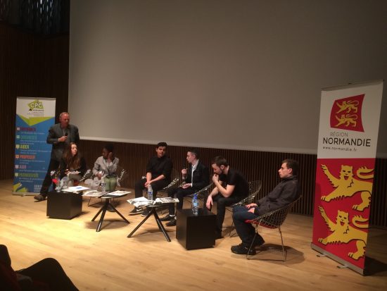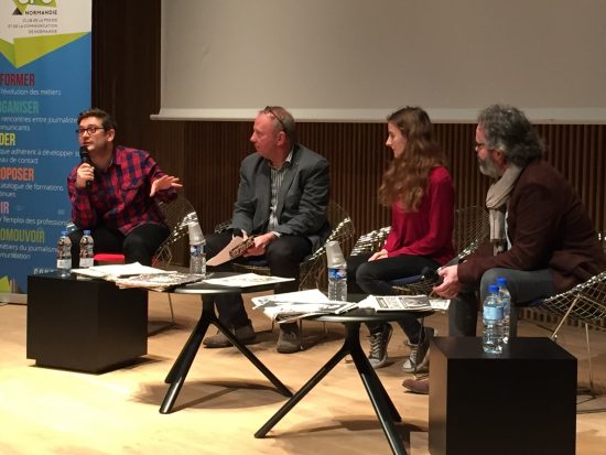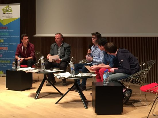 En ouverture a eu lieu un débat sur le thème “Les jeunes et la presse”, animé par Guillaume Garet, administrateur du Club et par ailleurs journaliste et directeur de l’agence AktuaProd. Il était entouré de Dorothée Brimont, JRI pour Paris Normandie, Thierry Delacourt, président du Club et rédacteur en chef adjoint de Paris Normandie, Jean-Michel Perreau, directeur délégué de Tendance Ouest et Stéphanie Séjourné, directrice de l’information Normandie pour Ouest-France.