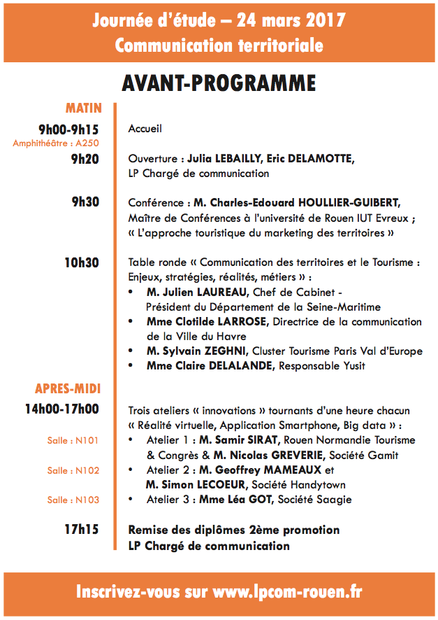 Des professionnels de la communication et du tourisme seront présents pour animer une conférence et une table ronde le matin, puis des ateliers l’après-midi. L’objectif est de permettre aux étudiants et aux professionnels de mieux cerner les évolutions des métiers de la communication territoriale ainsi que l’impact du numérique dans ce secteur. Si vous souhaitez assister à l’événement, inscrivez-vous ICI.