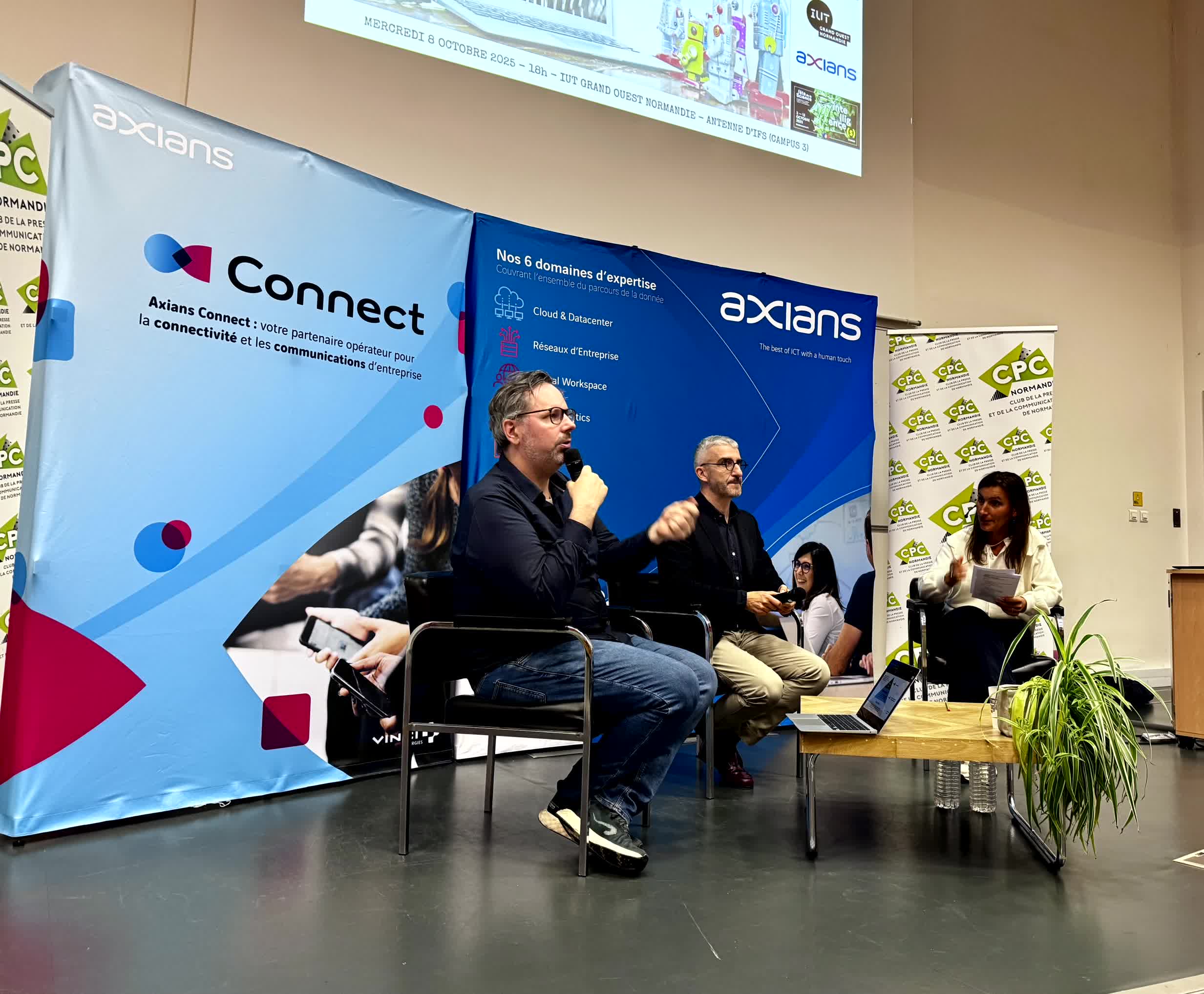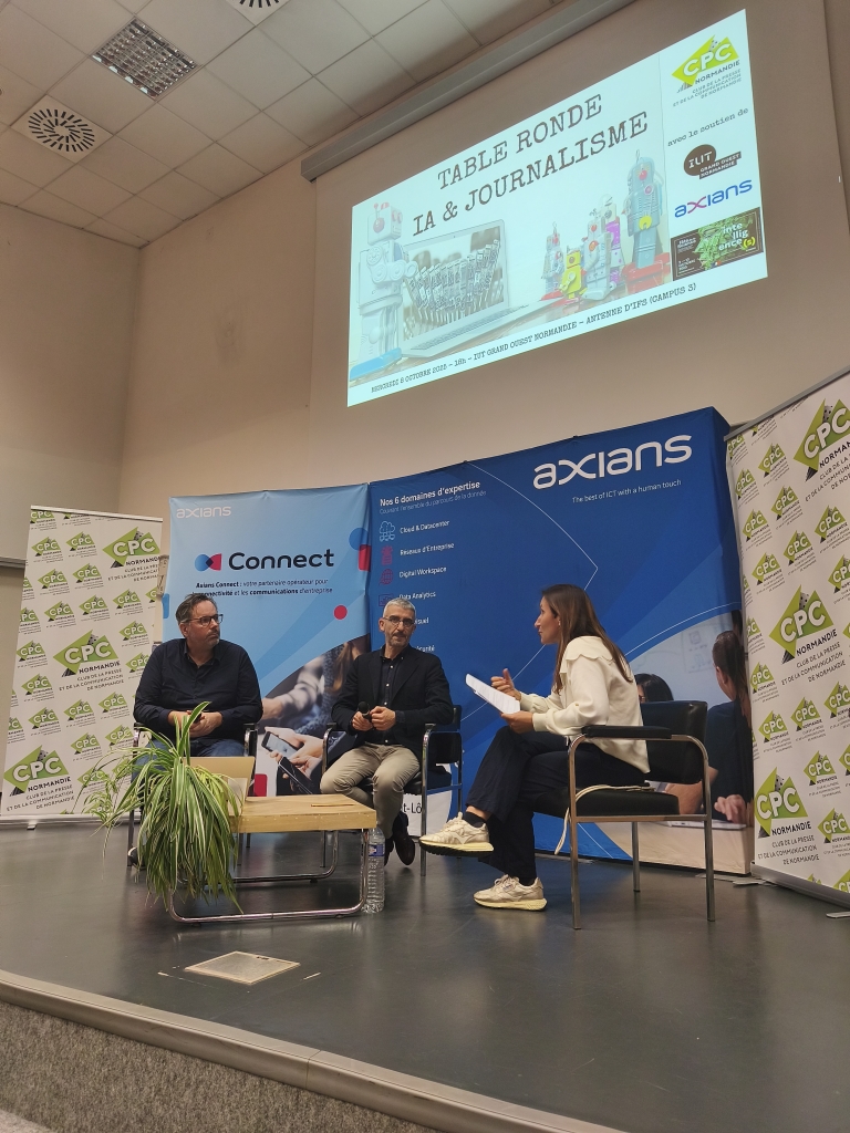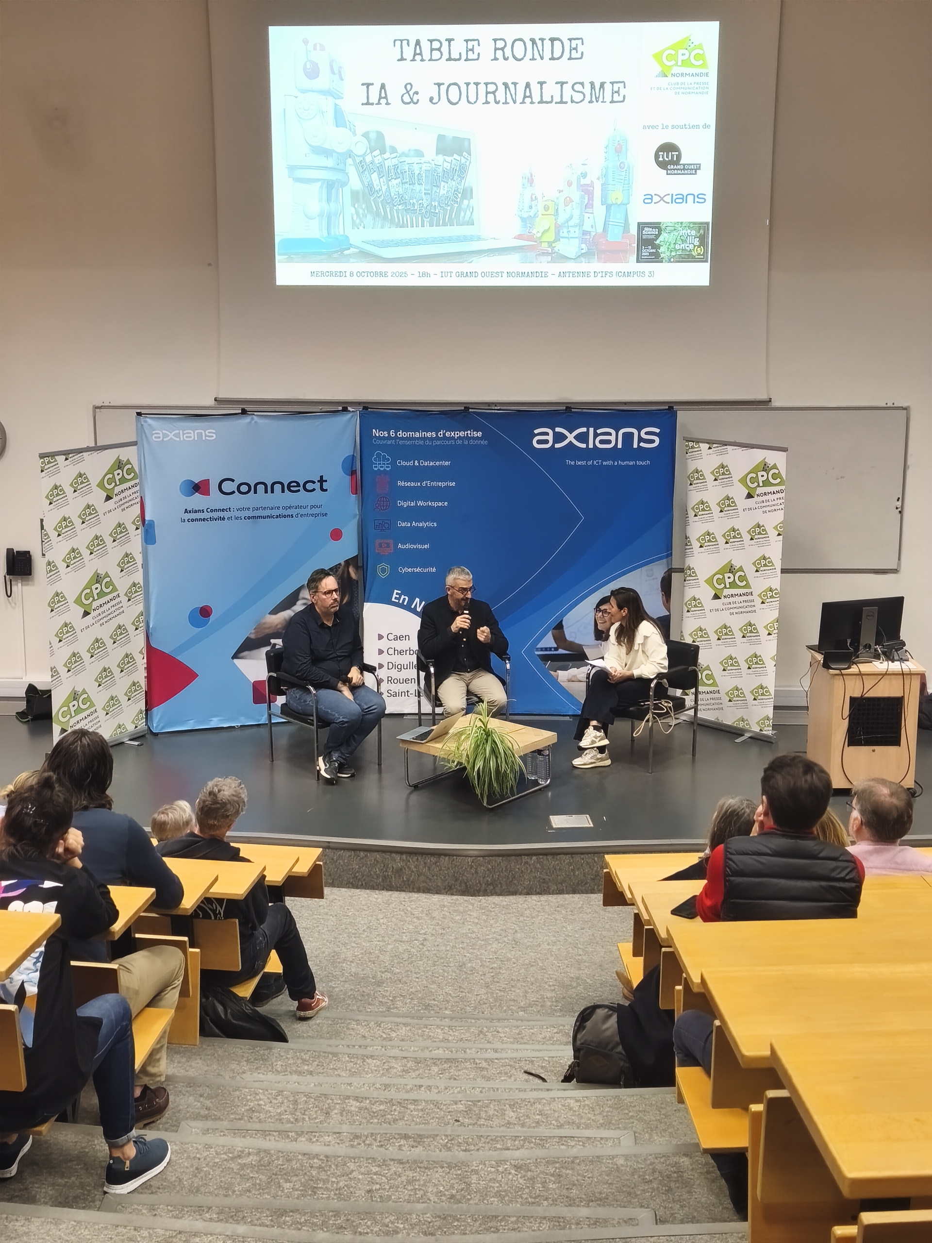 Mercredi 8 octobre, l’amphithéâtre de l’IUT Info Com d’Ifs accueillait une table ronde passionnante sur l’impact de l’intelligence artificielle dans le métier de journaliste, animée par Julie Lebailly. L’événement, soutenu par Axians Normandie, a réuni David Dieudonné, référent IA chez Ouest-France et Yann Guégan, journaliste pour Contexte, également vice-président du Conseil de Déontologie Journalistique et de Médiation (CDJM).