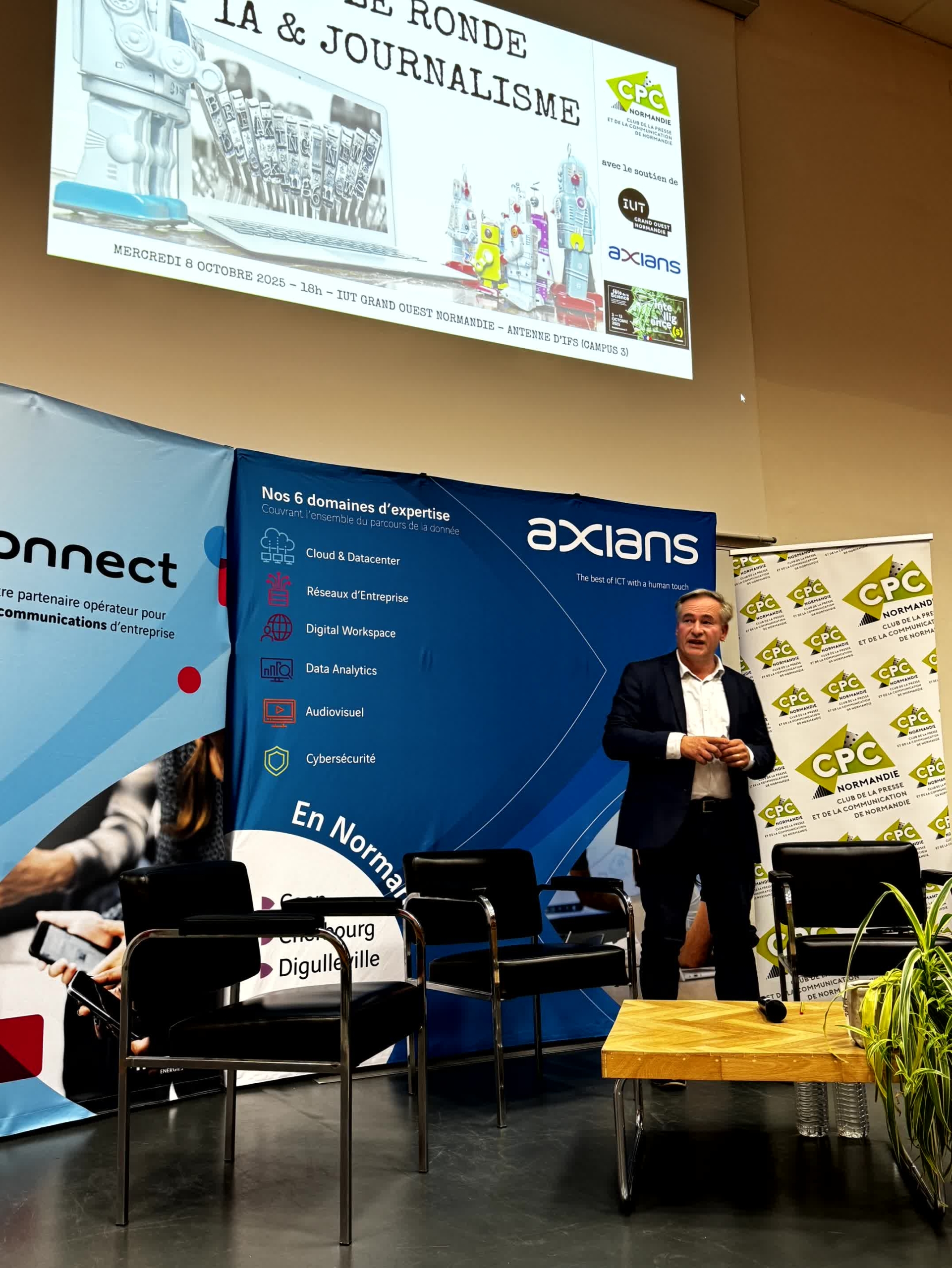 Serge Perier, directeur d’Axians Normandie, a ouvert la soirée en soulignant les enjeux cruciaux que soulève l’IA : la responsabilité du journaliste dans la génération de confiance, les questions économiques liées à l’évolution des effectifs, et surtout le contrôle de cette technologie qui pourrait influencer l’information elle-même.