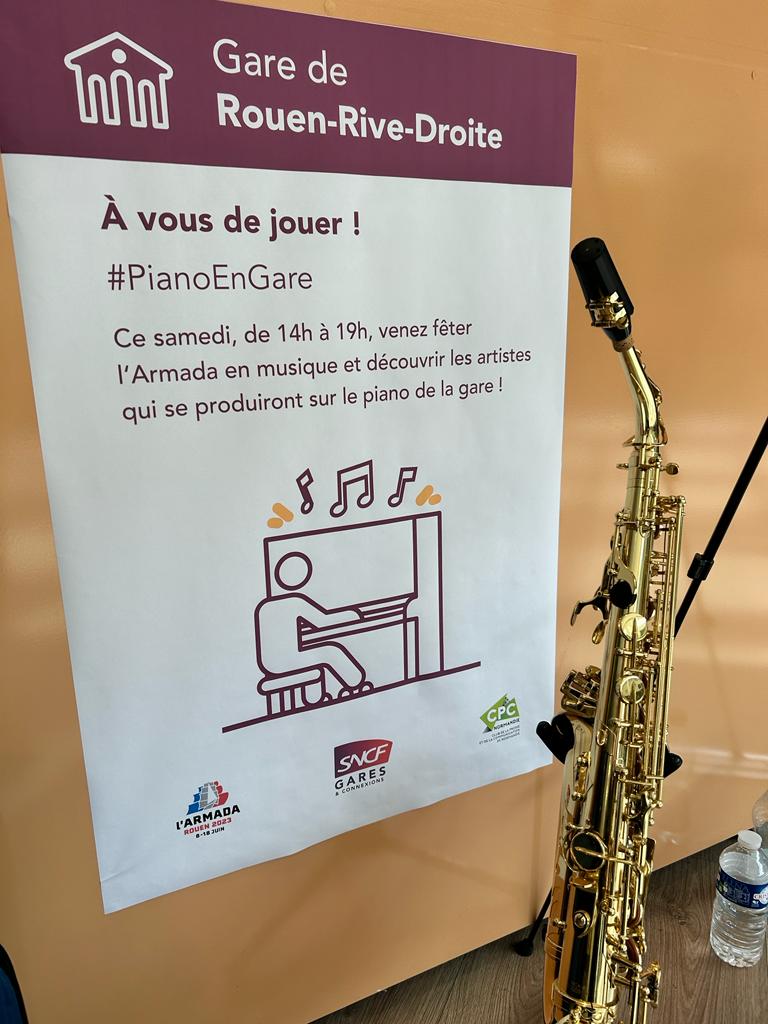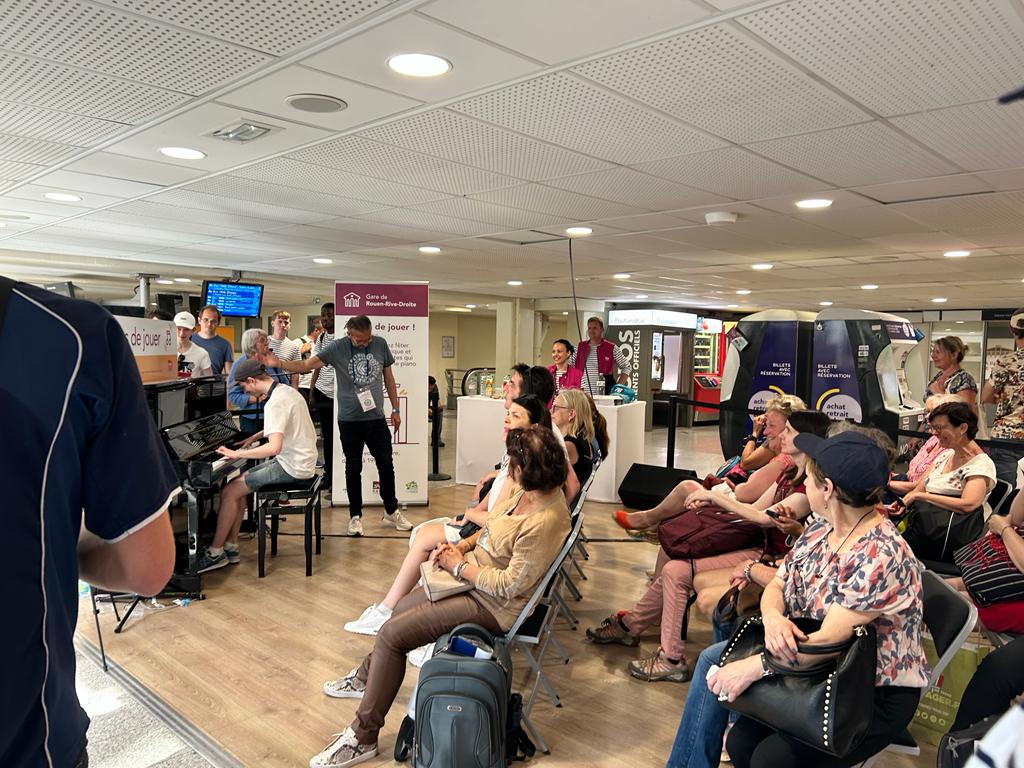 Il régnait une effervescence particulière ce samedi 10 juin en gare de Rouen. Pas de train en retard non ! Pas de grand départ en vacances : ça c’est pour dans quelques semaines. Plus simplement, l’enthousiasme communicatif d’une vingtaine de pianistes amateurs réunis pour fêter dignement l’Armada en musique.