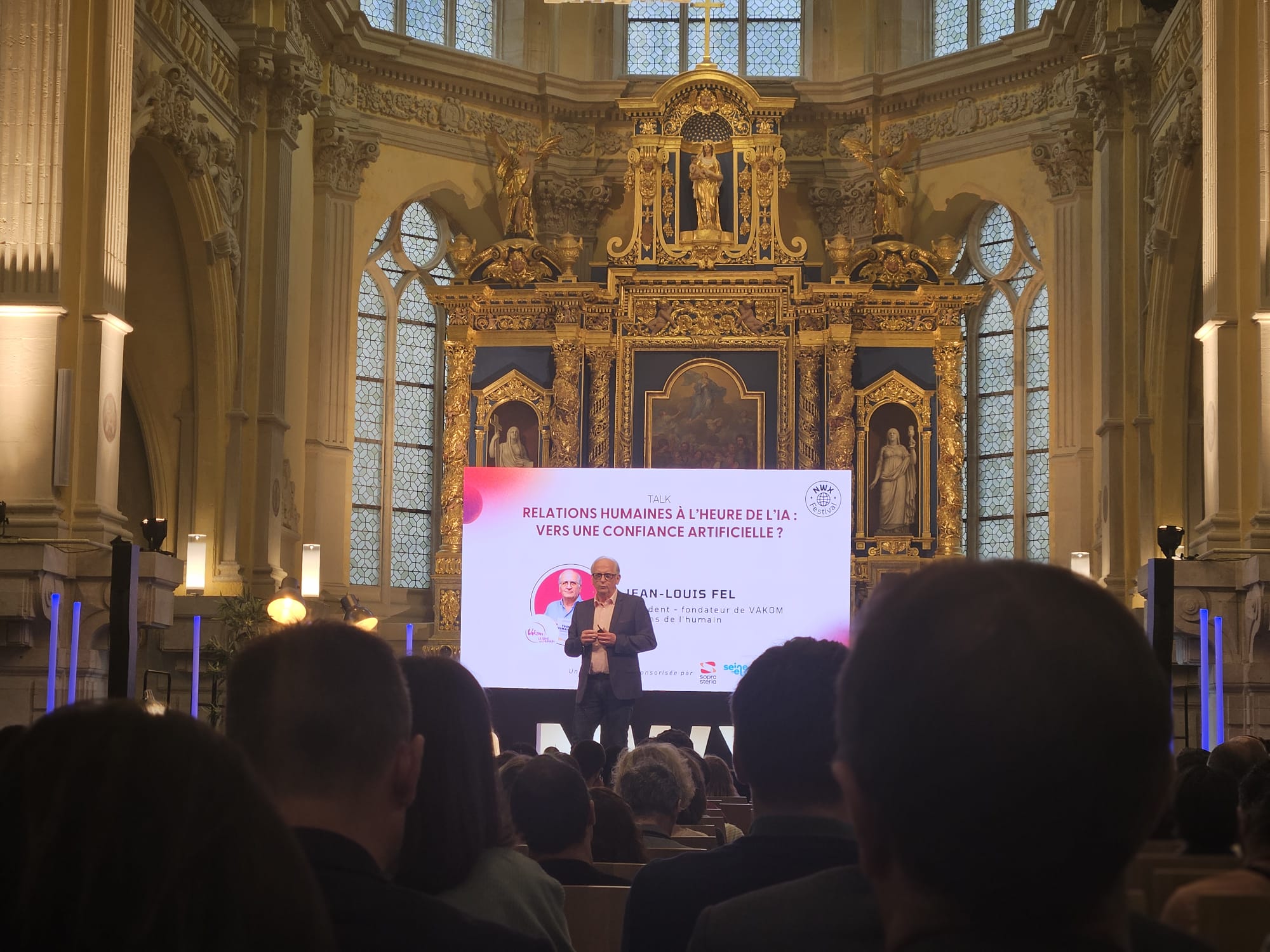 ➡️ Jean-Louis Fel, président et fondateur de Vakom, a parlé de la place de l’humain à l’heure de la révolution technologique de l’Intelligence Artificielle. Il faudra retenir ici que l’essentiel est de continuer à être reconnaissant des relations humaines.