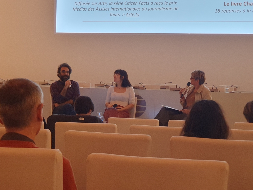 Après l’ouverture et la prise de parole de Nicolas Mayer-Rossignol, président de la Métropole, s’en est suivie la première table ronde où Nabil Wakim, journaliste Le Monde et Aude Favre, journaliste anti-fake news et présidente de l’association Fake Off, ont pu s’exprimer autour de la couverture médiatique du réchauffement climatique. Un sujet très complexe, le rendant parfois difficile à couvrir sans une expertise scientifique, explique Nabil Wakim. Aude Favre a mentionné le développement du journalisme de solution en remède à l’éco-anxiété et du journalisme collaboratif qu’elle pratique elle-même sur sa chaîne YouTube. Est venue ensuite la question du rôle des médias dans la régulation du débat. Au Monde, depuis quinze ans, il n’est plus question de laisser la parole aux climato-sceptiques. Concernant les solutions politiques à adopter, il est néanmoins important pour Nabil Wakim d’avoir une parole diversifiée. Pour le journaliste, il est surtout nécessaire d’aller plus loin que l’action individuelle : “On peut tous décider de prendre le vélo, mais si derrière les villes n’ont pas construit de pistes cyclables ça ne sert à rien”. La table ronde a continué autour des réseaux sociaux. Les deux journalistes ont mentionné le mouvement helloquittex, pour quitter le réseau social d’Elon Musk, ainsi que la dangerosité de certains contenus visionnés par les jeunes. Une matinée riche en réflexions et qui encourage à l’action face aux enjeux climatiques.