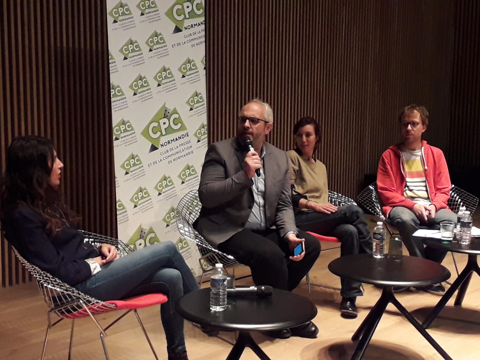 La rencontre portait sur la presse qui prend le temps d’enquêter et d’écrire, ces formats longs à contre-courant du rythme effréné des actualités. Sur le plateau : Léna Mauger, rédactrice en chef de la Revue XXI, fondée en 2008, et Marylène Carre et Simon Gouin, duo fondateur de Grand-Format, petit nouveau de la presse normande. Pour les interroger : Sébastien Bailly, administrateur du Club, journaliste, formateur, consultant et auteur.