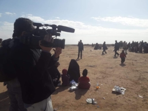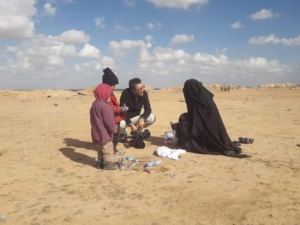 ´Rencontre en plein désert syrien avec une française qui vient de quitter daech. Son mari, un djihadiste français, est mort au combat. Sa première phrase : « Je veux dire à ma mère pardon pour toute la souffrance que je lui ai fait subir… ». Un de ses deux enfants lui tire la main et il murmure dans un français approximatif : « Maman on est mieux ici là-bas il faisait froid ». Quelques centaines de mètres plus loin, un vieil homme crie de douleur. Il a été blessé par un obus en essayant de fuir…’