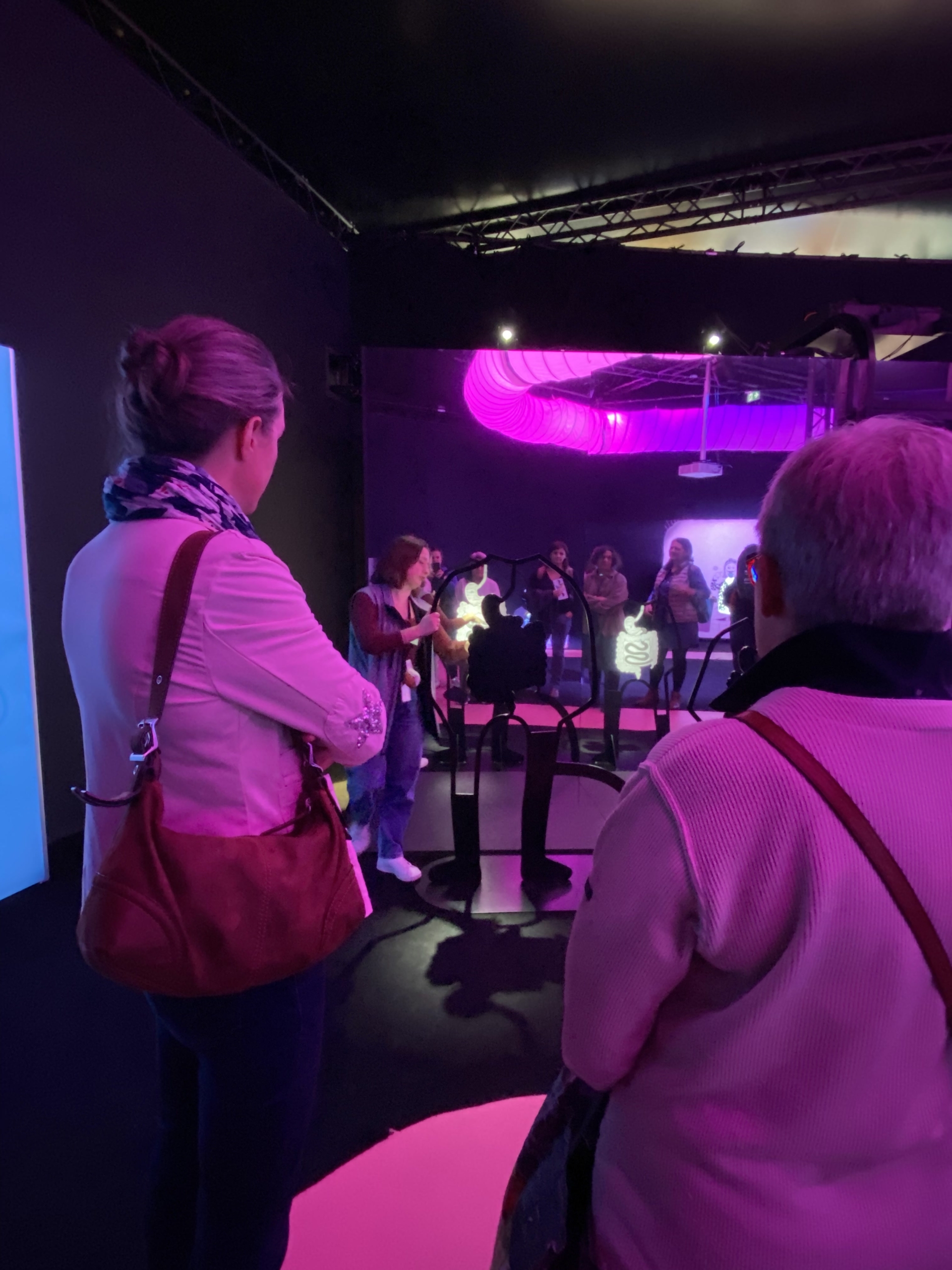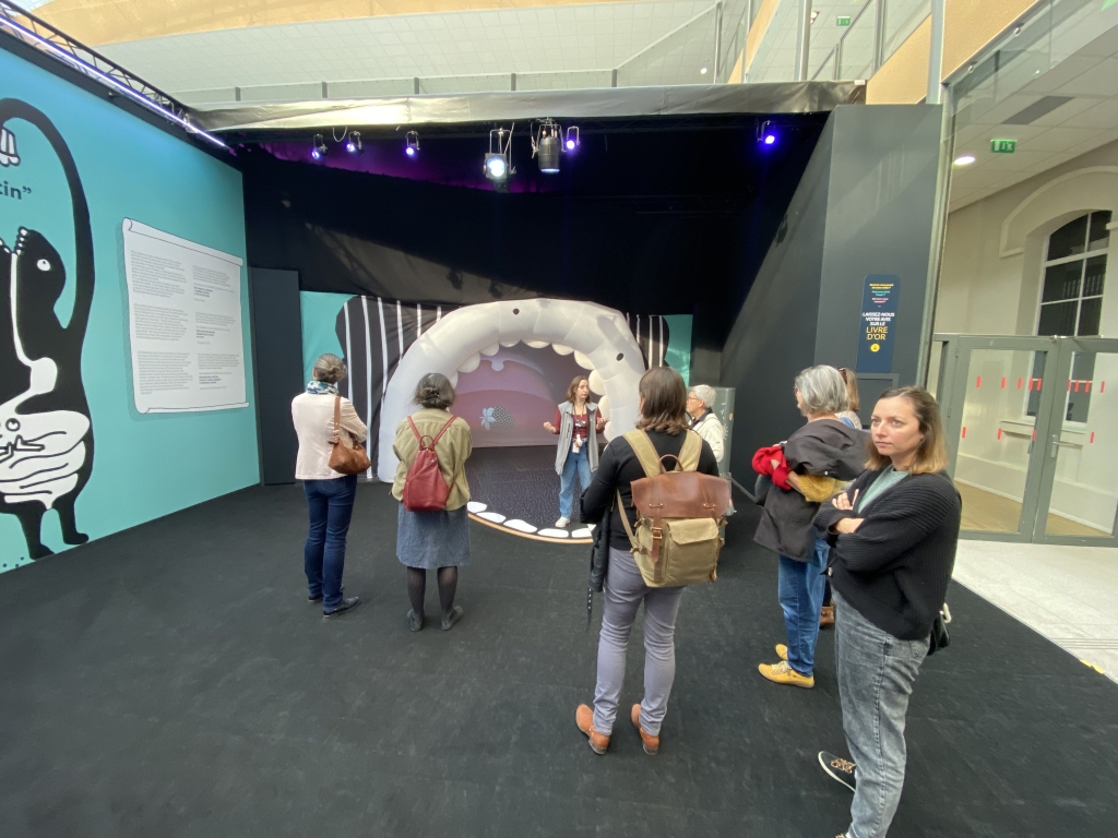 L’espace d’exposition de 1000m2 de ce dernier est divisé en deux parties. Une dizaine d’adhérents du Club, accompagnée d’une médiatrice ont ainsi pu découvrir dans un premier temps “Microbiote, d’après le charme discret de l’intestin”. Inspirée du best-seller de Guilia et Jill Enders, l’exposition raconte de façon décomplexée et décalée la vie étonnante du microbiote qui habite notre système digestif. Le parcours débute devant l’entrée d’une bouche géante et invite ainsi à suivre le chemin des aliments dans notre corps.
