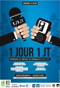 Un Jour, un JT est un concours organisé à destination des 15-25 ans haut-normands. L’objectif est de sélectionner 8 équipes, qui partiront pendant une journée tourner et monter un reportage encadré par un journaliste professionnel, avec nos partenaires : France 3 Haute-Normandie, Biplan, France Bleu Haute-Normandie, La Chaîne Normande, Aktuaprod, RCF et Lumen Production. Les réalisations seront présentées à la façon d’un JT lors d’une soirée de remise de prix à l’Omnia République de Rouen.