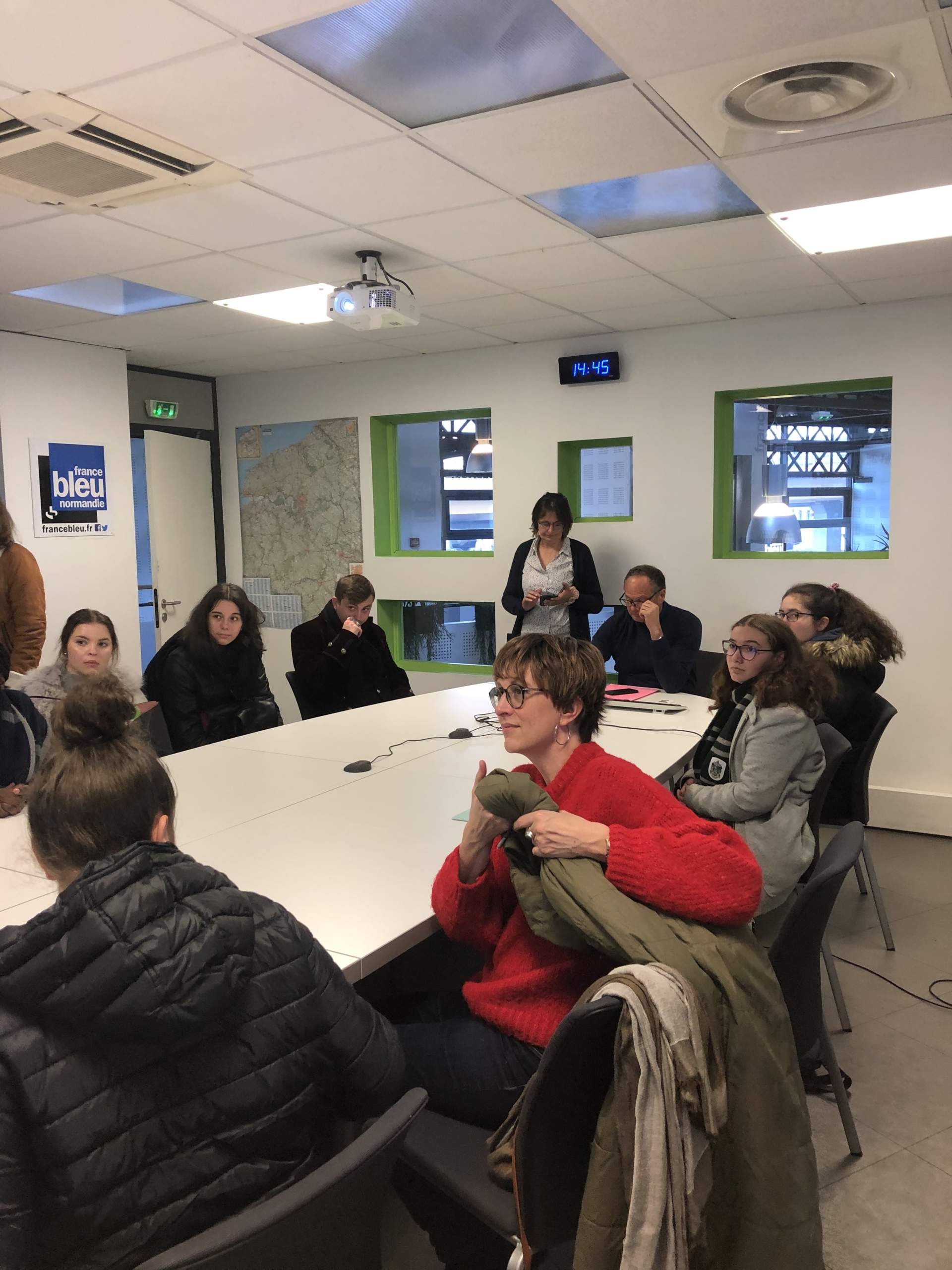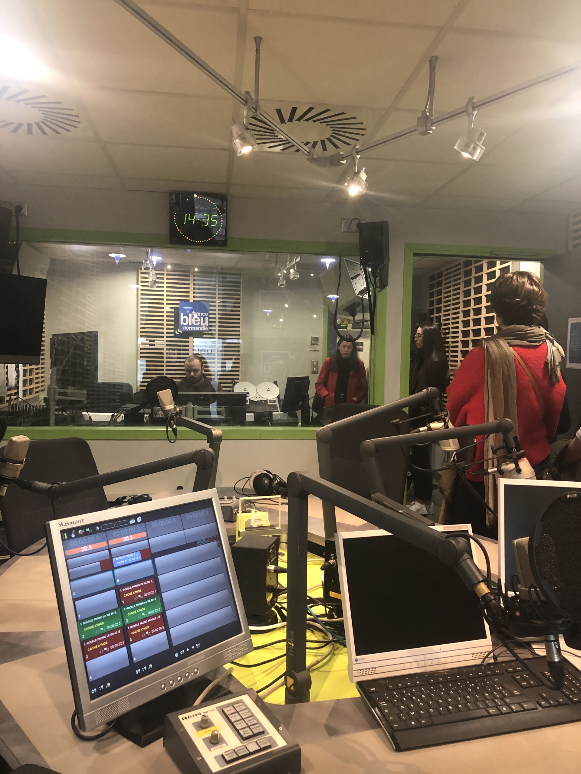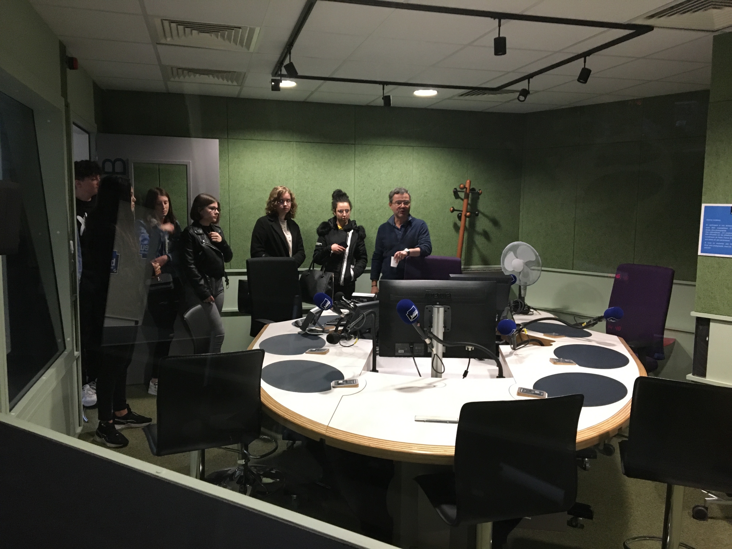 A Rouen, trois visites d’entreprises ont également été proposées : chez Virgin Radio pour une visite de la station avec l’équipe qui y travaille en région. Puis, un groupe de jeunes (lycéens ou volontaires en service civique) et leurs accompagnateurs (professeurs, tuteurs, parents) ont pu découvrir le cadre de travail des journalistes, animateurs et techniciens de la station France Bleu à Rouen. Par ce biais, tous ont pu accéder aux « coulisses » de la conception d’émissions, observer les techniques à mettre en place pour monter une journée d’antenne ainsi que l’organisation constitutive du métier de journaliste. Par la suite, notre guide, Delphine Garnault, la rédactrice en chef, nous a ouvert les portes des différents studios d’enregistrement des émissions, des annonces, des interviews etc. Après l’envers du décor de la conception, Pierre Desaint, le directeur s’est joint au groupe afin d’expliquer les différents concepts et notions à mettre au place au sein d’une radio régionale ; il a également abordé les démarches mises en place dans le contexte de l’incendie de l’usine Lubrizol. Enfin, un temps d’échange avec le directeur a permis d’expliciter les principes de ligne éditoriale, les distinctions entre le métier de journaliste et d’animateur, mais aussi, les différentes démarches d’orientation à mettre en œuvre pour se professionnaliser dans les métiers de la radio. Par ailleurs, en partageant son parcours personnel, Pierre Desaint a évoqué les transformations de l’accès à de telles professions, en privilégiant deux mots d’ordre : faire preuve de volonté et être curieux pour faire des rencontres, qui pourront (peut-être) tout changer.