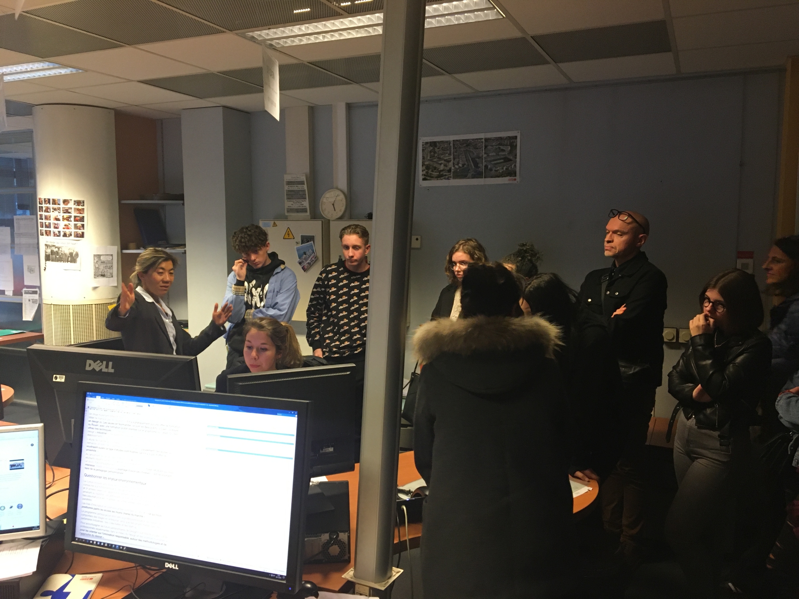 À Ouest-France, c’est Stéphanie Séjourné, cheffe des informations régionales Normandie qui a accueilli le même groupe, complété de quelques adultes eux aussi en réorientation professionnelle. Pour répondre au mieux aux attentes des participants, la journaliste a d’abord pris le temps de présenter le quotidien dans sa globalité, ses différentes éditions et son fonctionnement du local à l’international et de l’international au local. Elle a expliqué que si le support numérique avait fait perdre des abonnés papier, il permettait aussi aujourd’hui au journal de toucher un lectorat au-delà de son territoire de diffusion physique. Elle a ensuite guidé le groupe dans les différents bureaux pour présenter ses collaborateurs et les différents métiers : accueil, photographe, secrétaire de rédaction. Le groupe s’est aussi arrêté un moment auprès du desk qui organise la présence en ligne du journal.