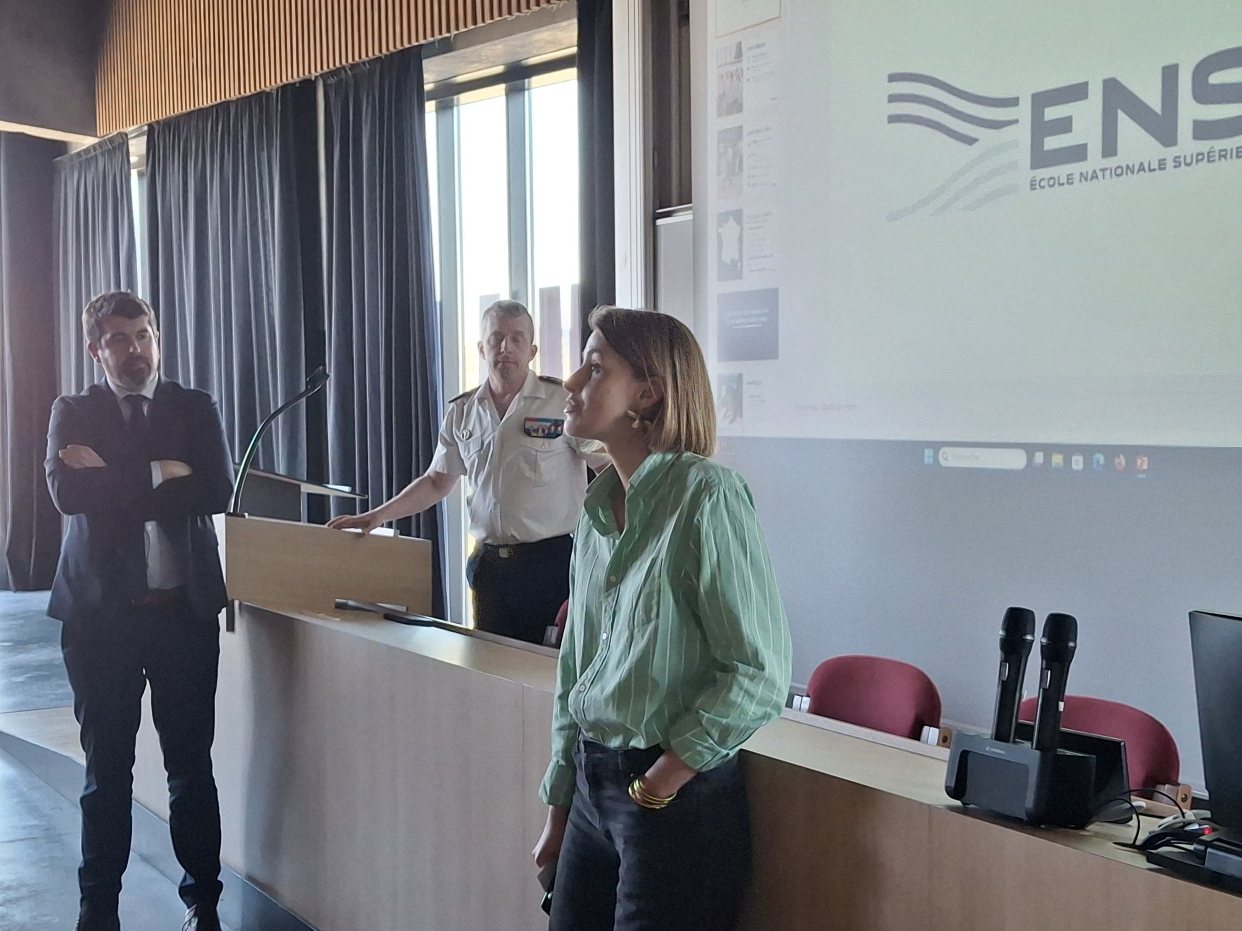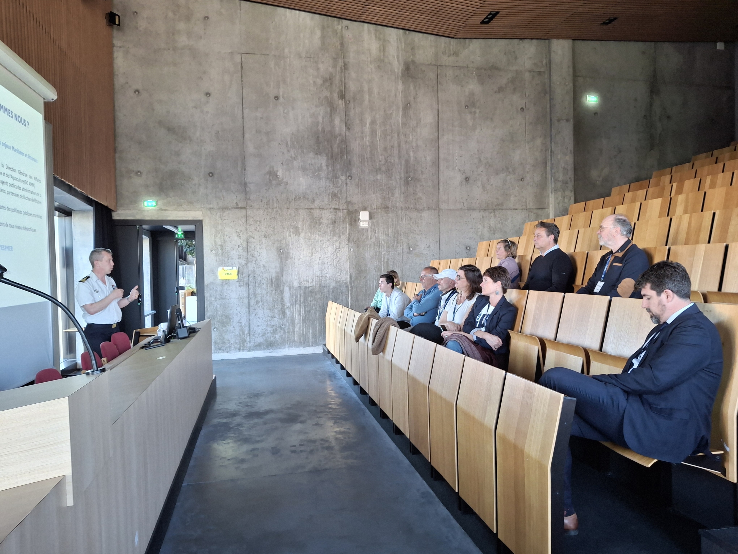 François Lambert a présenté l’Ecole Nationale Supérieure Maritime qui forme les officiers de la Marine Marchande et des ingénieurs en génie maritime. Et cela sur quatre sites : Le Havre, Marseille, Nantes et Saint-Malo, avec trois types de formations : initiale, professionnelle et continue. Ensuite, Guillaume de Beauregard a dressé le portrait de l’ESPMer qui forme tous les agents publics qui œuvrent au quotidien pour porter les politiques publiques de la mer, du littoral et des ports. Elle a un statut de service à compétence nationale rattaché à la Direction Générale des affaires maritimes de la pêche et de l’aquaculture, sous l’autorité du ministre chargé de la mer. La colocalisation des deux écoles est un véritable atout pour la formation maritime sur le territoire. Valentine Lesoudier est ensuite revenue sur son parcours, puis a évoqué ses missions pour les quatre sites de l’ENSM.