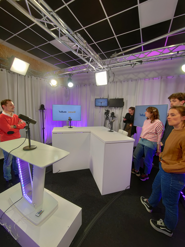 Ce studio, équipé de manière professionnelle, est conçu pour accueillir des interviews, des émissions en direct, des podcasts et bien d’autres types de contenus. Il peut être aménagé pour se transformer en un plateau « canapé », plateau institutionnel et version Twitch.