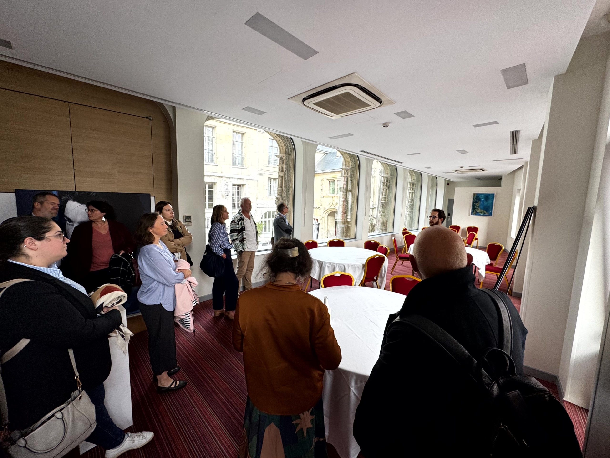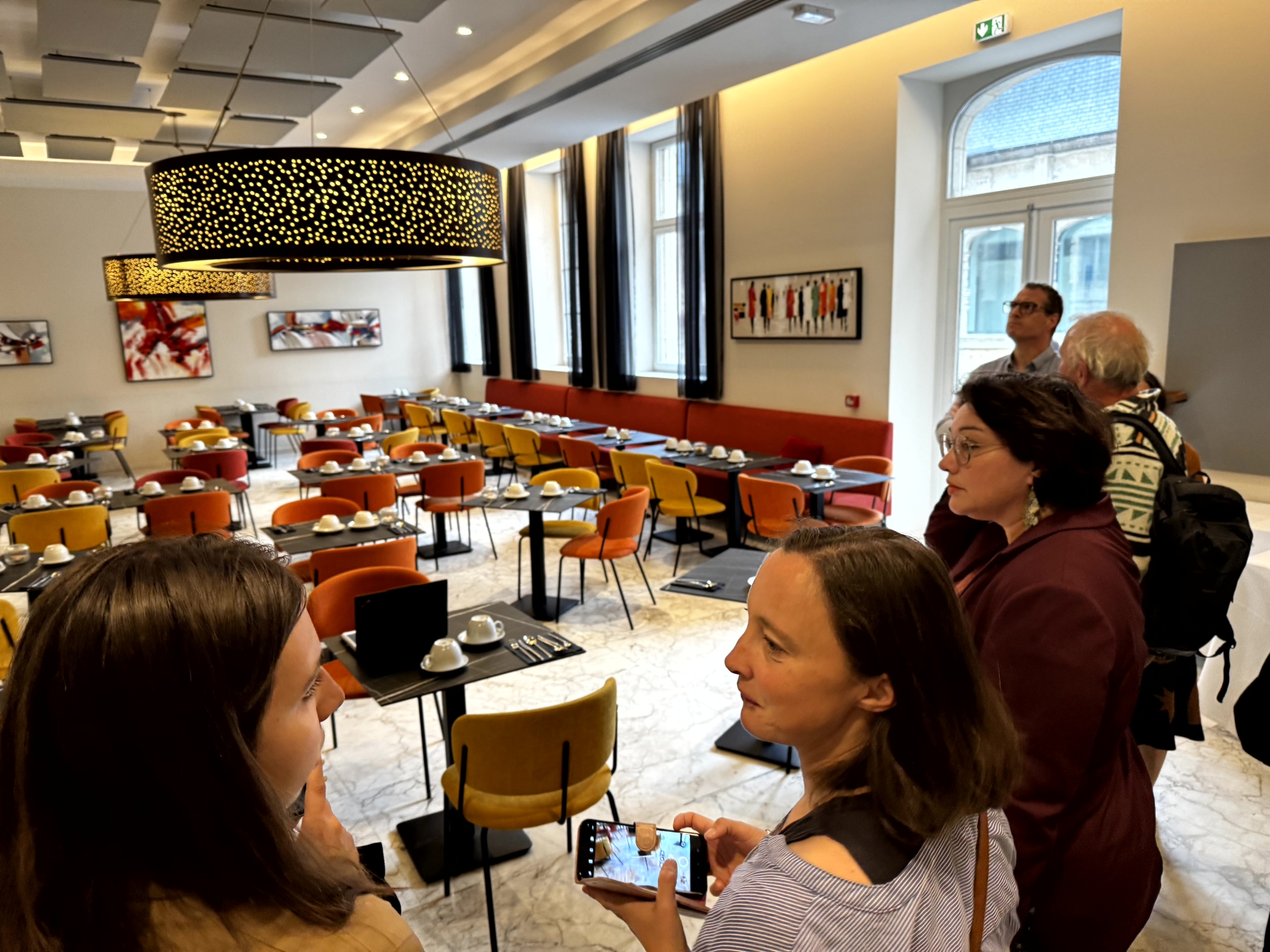 Élise et Tristan menant les deux groupes de visite, ont souligné le caractère unique de chaque chambre, adaptation nécessaire à l’architecture historique du bâtiment. Des espaces classiques de vingt mètres carrés aux suites prestigieuses de quarante mètres carrés, l’établissement propose une gamme complète d’hébergements. Au-delà des chambres, nos adhérents ont pu apprécier les espaces ouverts au public : le bar L’Atrium, le restaurant L’Aumale et le spa, accessibles à tous sans nécessité de séjourner sur place. Ainsi que certaines des salles de séminaires, comme la sublime salle du Conseil donnant à la fois sur la cour d’honneur et le temple Saint-Éloi.