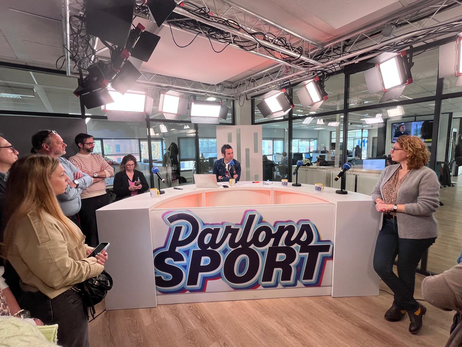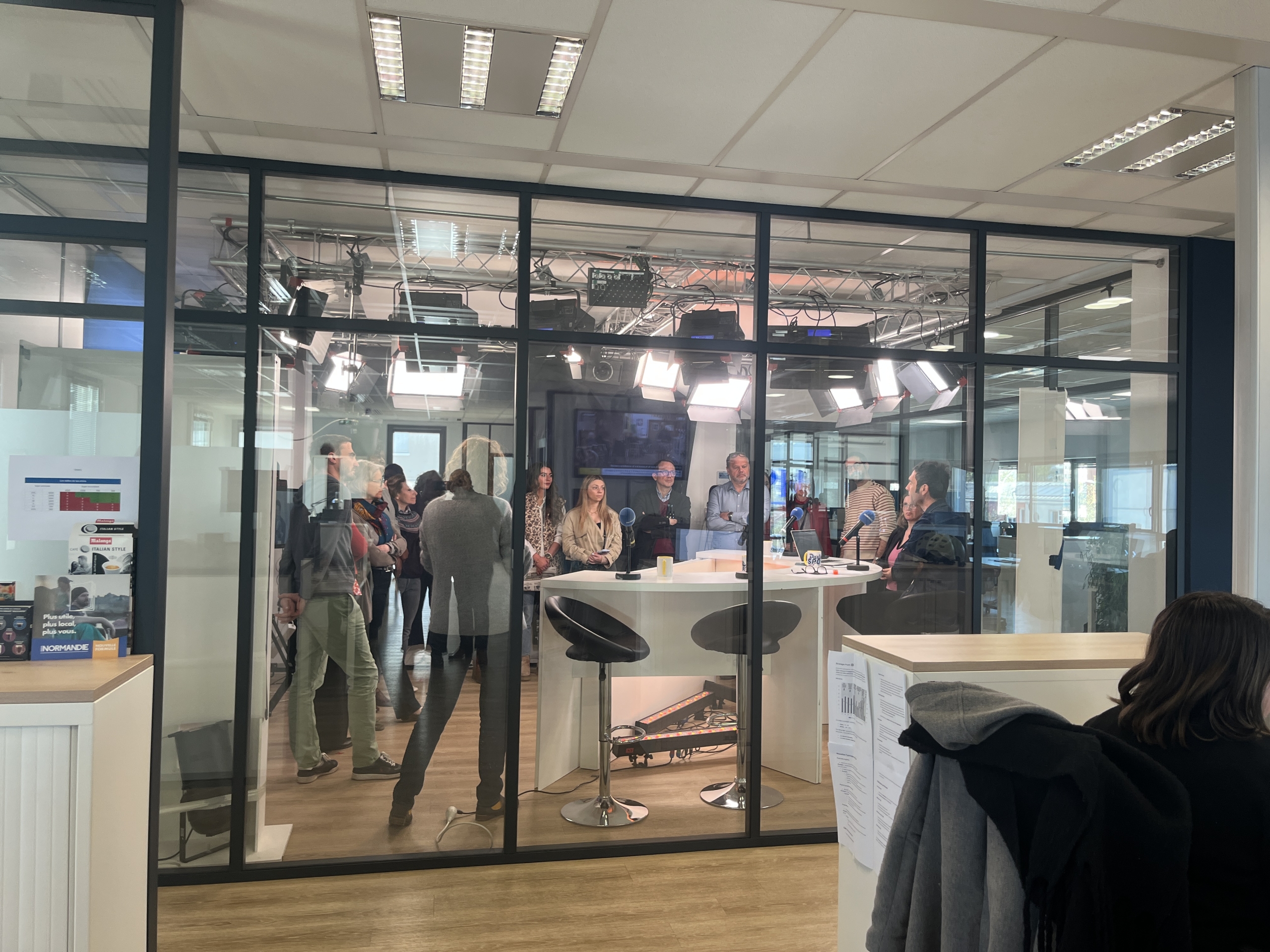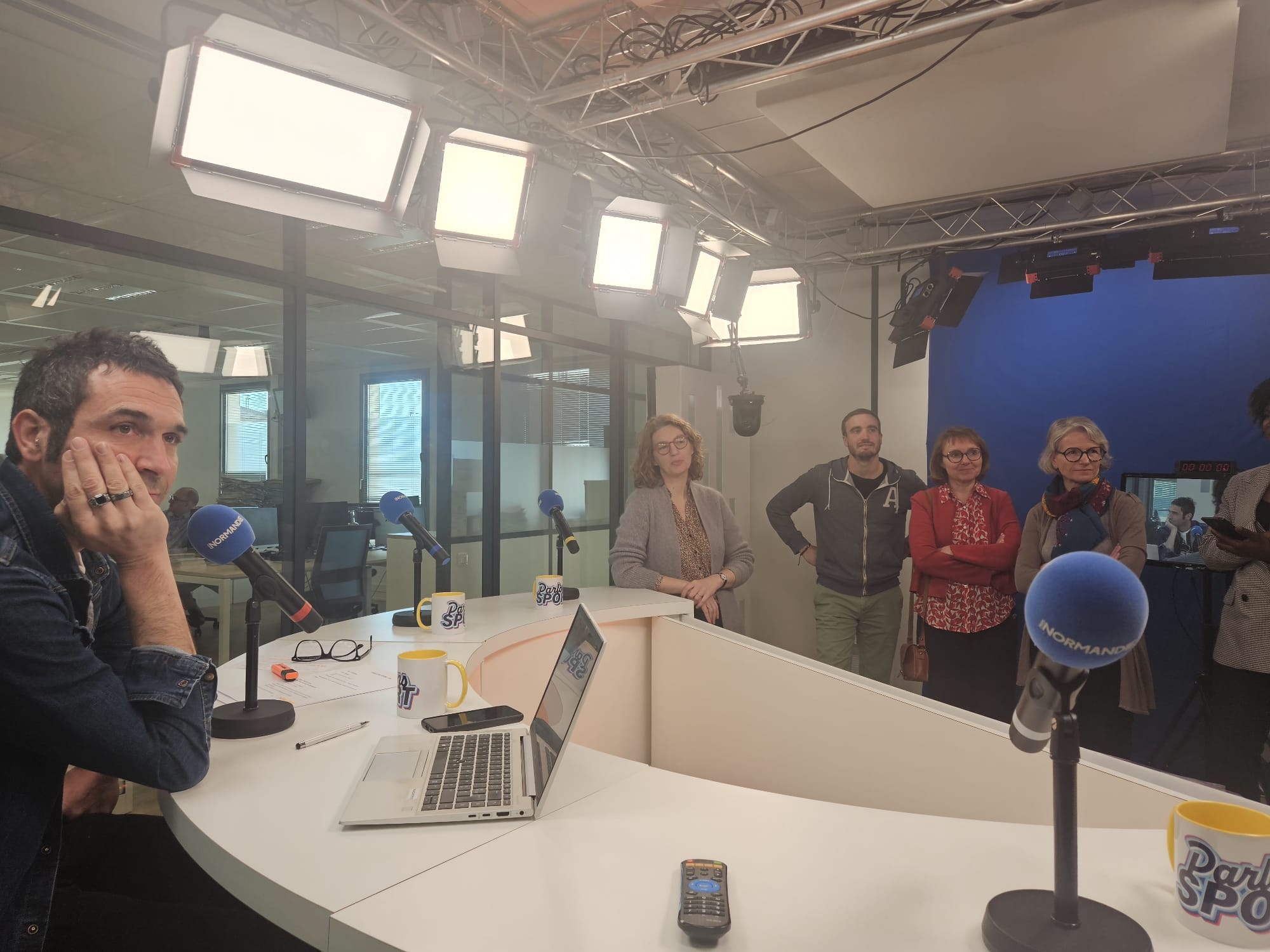 Après cette présentation riche, place à la visite dans les différents services. Le groupe est passé par le service de la locale rouennaise (qui couvre 144 communes sur les trois EPCI Rouen, Caux Vexin et Austreberthe) auprès de Céline Bruet, la section Loisirs avec Marie-Christine Urset qui prépare les numéros d’été, le service web (disponible de 6h à 22h en continu), le marketing, le sport avec Matthias Rogier, le service reportage avec Stéphane Siret puis le studio vidéo avec Thomas Dubois et Santiago Richard juste avant de recevoir Quentin Becquey, manager des Huskies, pour l’enregistrement de l’émission Parlons Sport.
