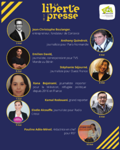 Durant une semaine, le Club a diffusé, chaque jour sur son site, des podcasts ayant pour thèmes : “Regards croisés sur le métier de journaliste à l’étranger” et “Impacts de la Covid-19 et des mesures sanitaires sur le métier de journaliste en France”. Parmi les intervenants, nous comptons Rana Bojairami, Anthony Quindroit et Kamal Redouani, journalistes et adhérents du Club, mais également six autres journalistes normands ou internationaux.