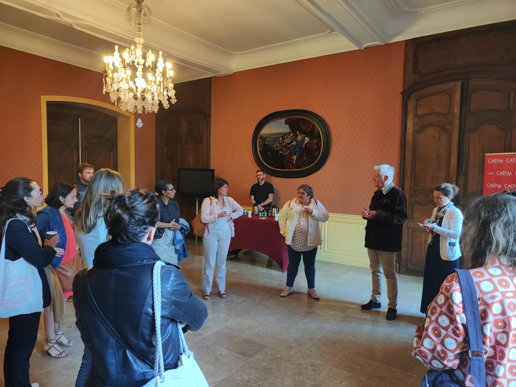 Après un accueil café dans le Salon du Maire afin que les participants puissent se présenter, Patrick Nicolle, adjoint à la Culture et au Patrimoine de la Ville de Caen les a ensuite accompagné dans la salle du Scriptorium de l’Hôtel de Ville de Caen afin qu’ils puissent découvrir l’exposition.
